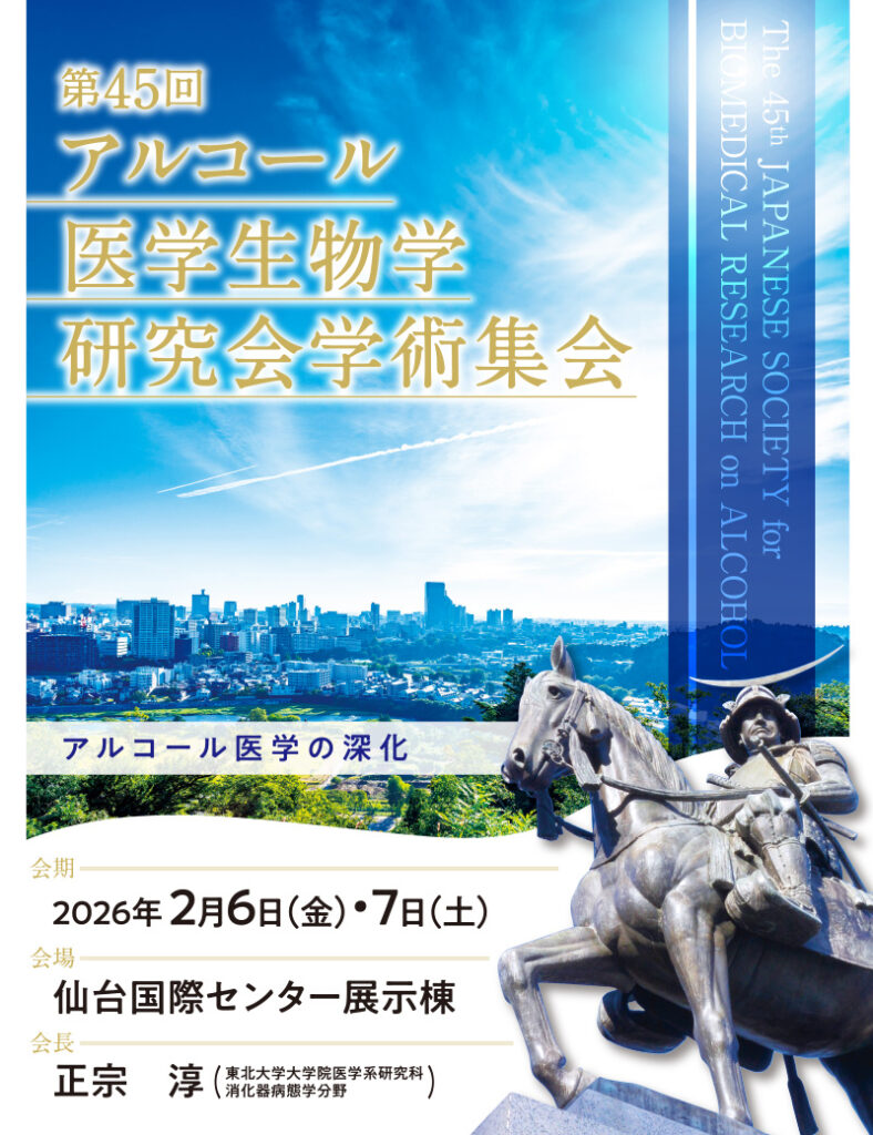 当科 正宗 淳 教授が会長を務める第45回アルコール医学生物学研究会学術集会が、2026年2月6日(金)・7日(土)の2日間、仙台国際センターにて開催されております。